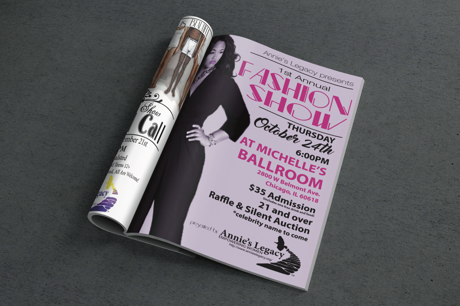 Their 1st Fashion Show fundraiser flyer is shown here. This and other pieces were done pro bono from 2007 through 2011.